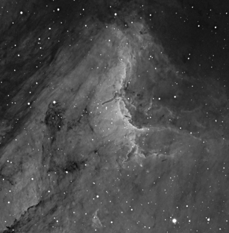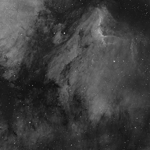 notes: Die zwei prominenten Sterne des Pelikan-Nebels sind nicht die den Nebel ionisierenden Sterne. Der anregende heiße und UV-Licht emittierende Stern der Spektralklasse O6 liegt im Dunkelnebel LDN 935. Dieser Dunkelnebel trennt den Pelikan - vom Nordamerika Nebel. Die Ionisationsfront beim Elefantenrüssel zeigt ihre konvexe Seite zum ionisierenden O6 Stern.