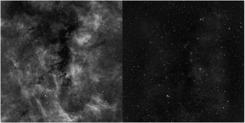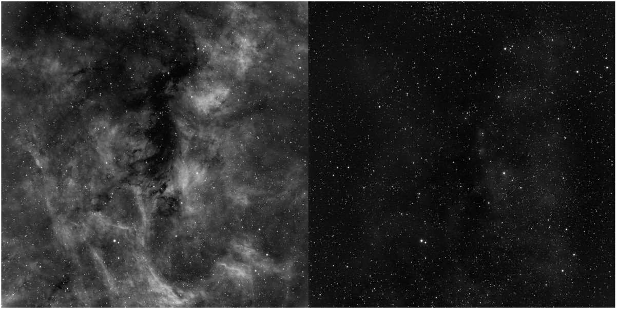 notes: Das Signal des doppelt ionisierten Sauerstoff (OIII) gegenüber dem einfach ioniserten Wasserstoff (Ha) ist sehr schwach. Dies erfordert lange und viele Einzelbelichtungen des OIII-Kanales, um ein genügend hohes Signal-Rausch Verhältnis für eine satte Bearbeitung zu erhalten.
